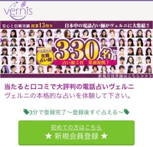 電話占いヴェルニは在籍占い師が330名、有名な占いの館5社とも提携している老舗の電話占いサイトです。