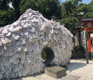 まずは本殿を参拝し、「形代」に切りたい縁・結びたい縁などの願い事を書き、「形代」を持って願い事を念じながら碑の表から裏へ穴をくぐります。